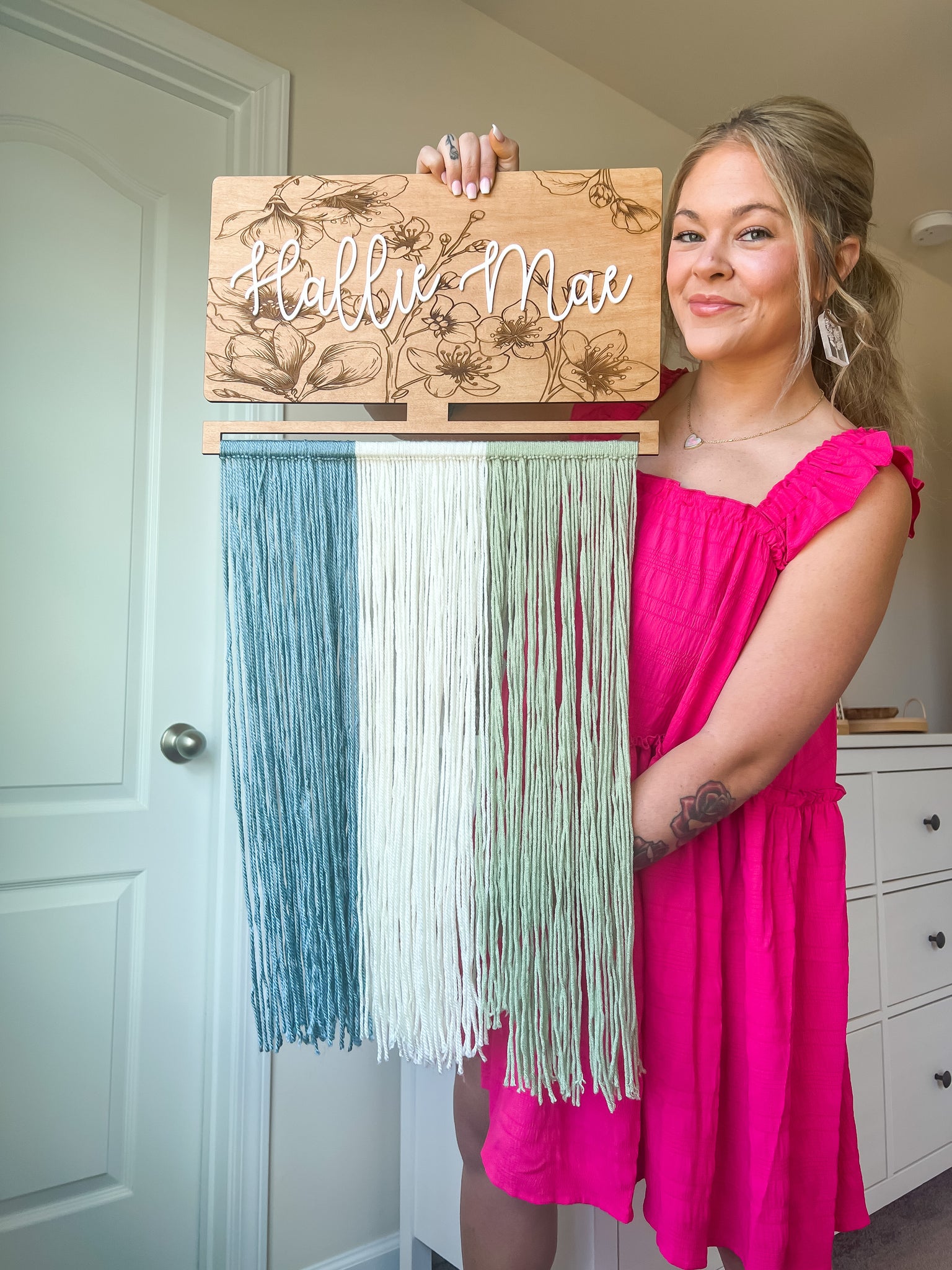 Keep your bows neat, organized, and beautifully displayed with our floral engraved wooden bow holder. Measuring 18” wide x 11.5” tall, with 50” long hanging strings, this piece combines practicality with a timeless floral design—making it the perfect addition to any nursery, bedroom, or playroom.